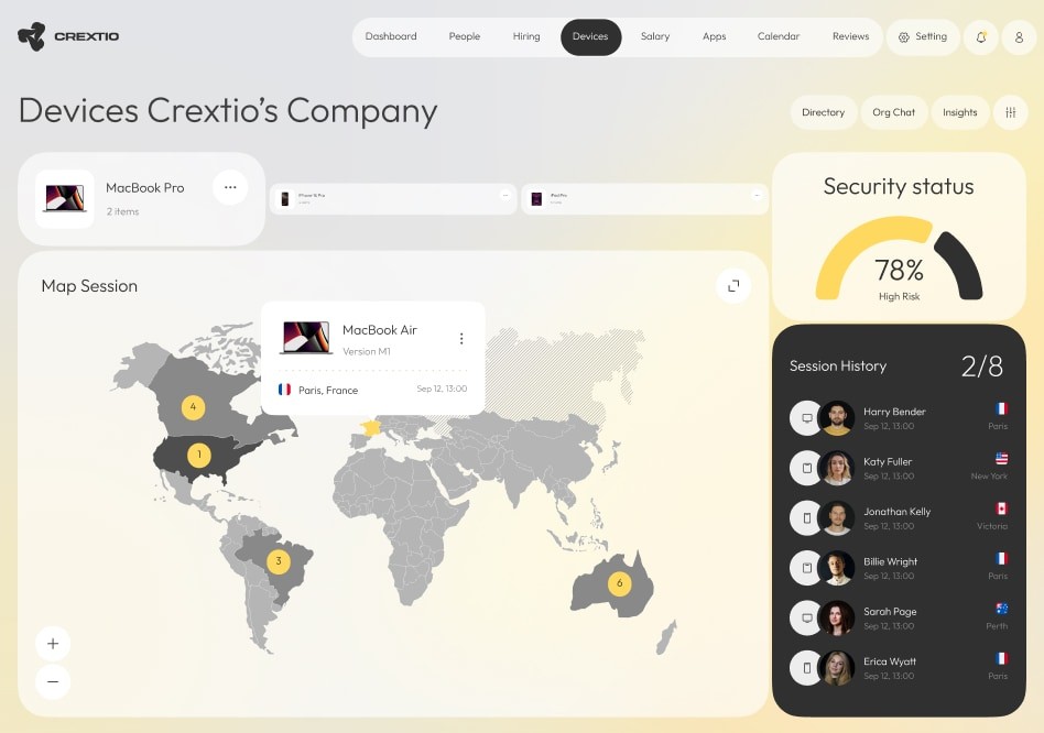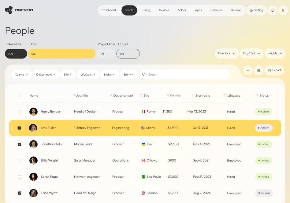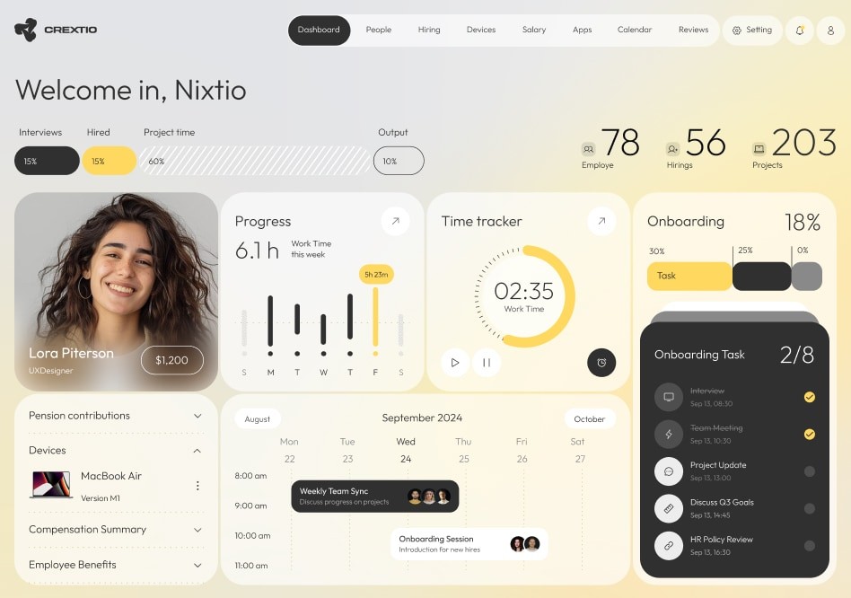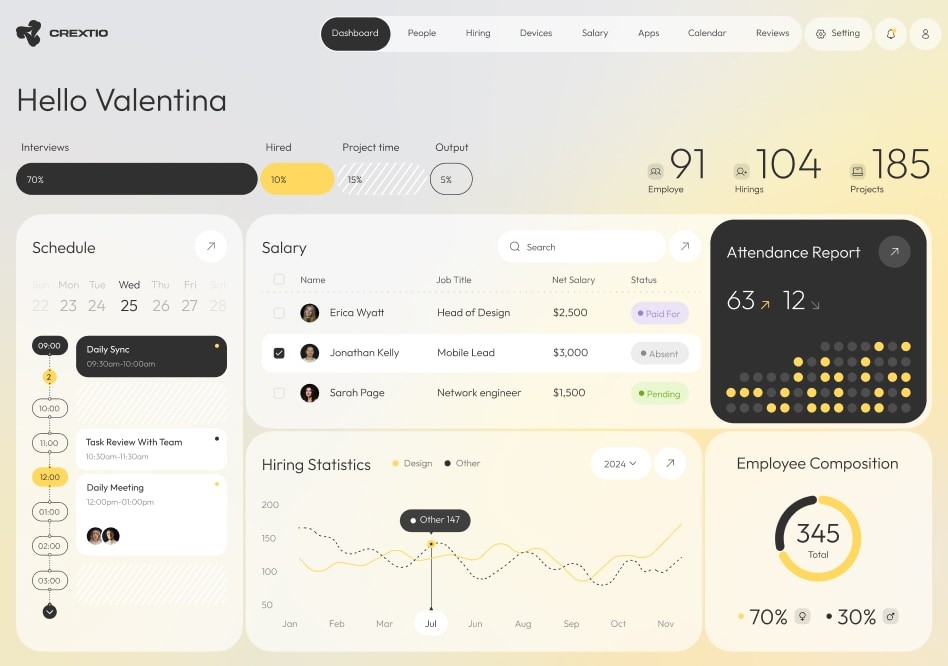 Crextio – HR Management Platform. A dashboard that enables HR teams to assess performance, track engagement, and manage turnover seamlessly.